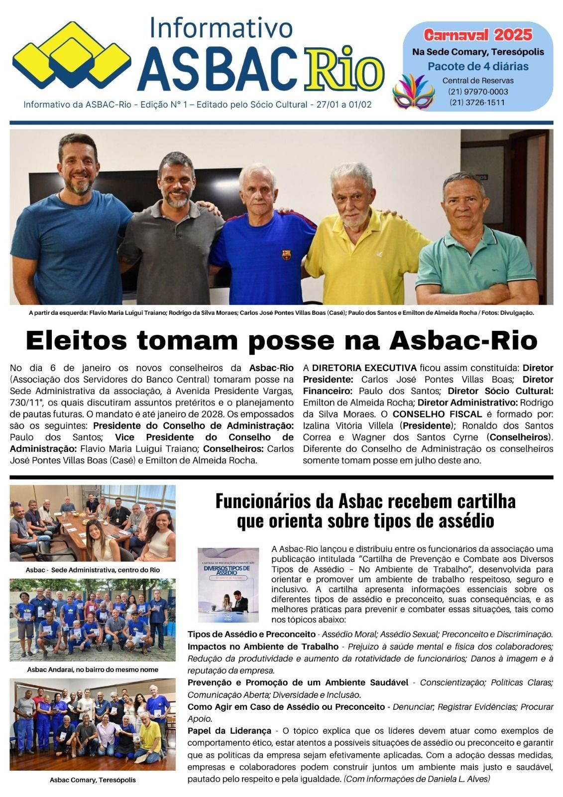 Segunda-feira, 6, os novos conselheiros da Asbac-Rio (Associação dos Servidores do Banco Central) tomaram posse na Sede Administrativa da Associação, à Avenida Presidente Vargas, 730/11°, os quais discutiram assuntos pretéritos e o foco nas pautas futuras. Os eleitos são os seguintes: Presidente do Conselho de Administração – Paulo dos Santos Vice Presidente do Conselho de Administração – Flávio Traiano Conselheiros – Carlos José e Emilton Rocha